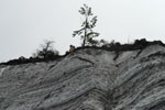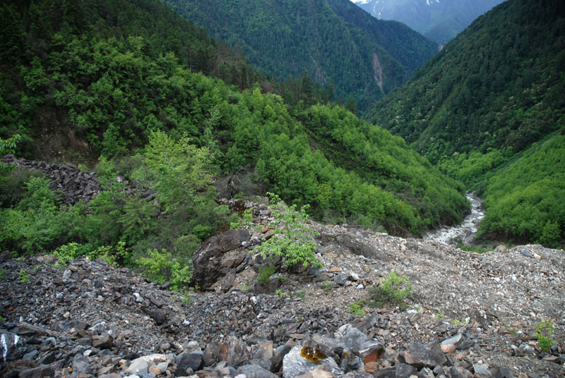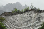 The glacier tongue is about 6km long and has an almost flat slope. It is covered with a thick layer of gravel and rocks. Trees are growing on the gravel layer on top of the glacier.