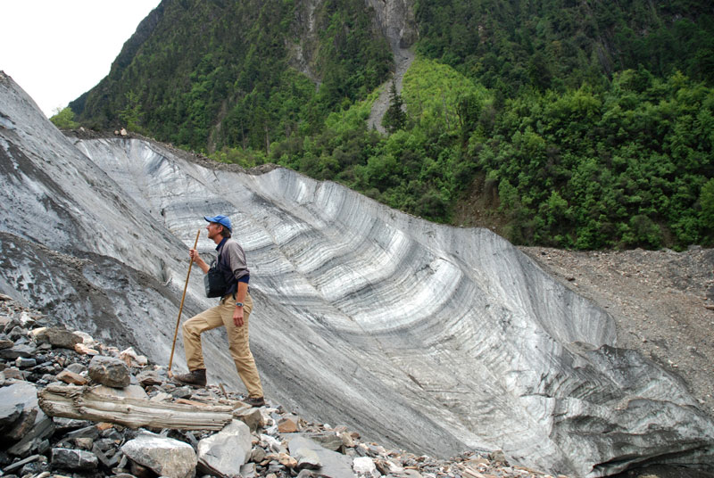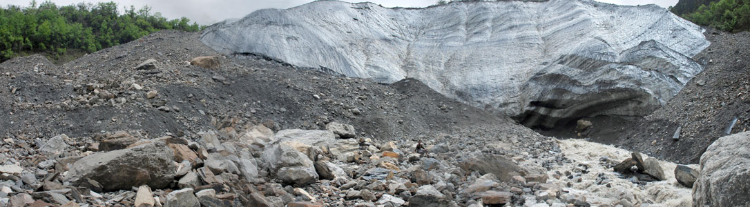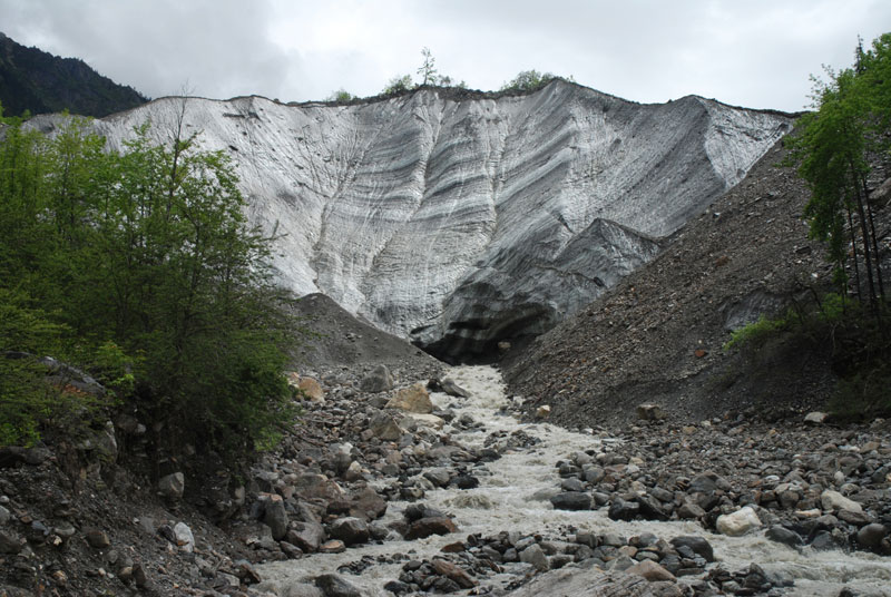 The glacier is a huge block glacier with an amazing layer of gravel on top. The gravel is substrate for trees (poplar trees and sea buckthorn trees). The glacier is an amazing sight!